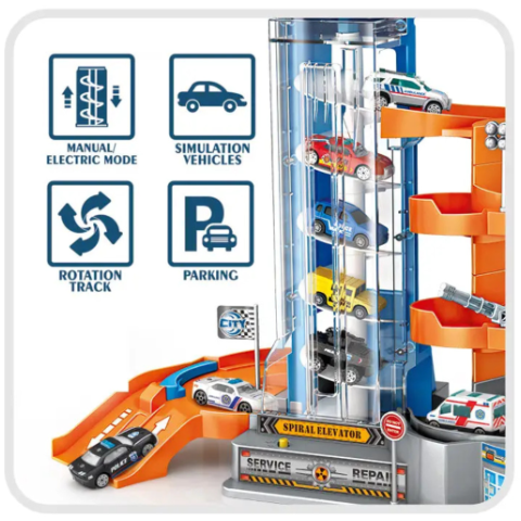 Liftul în spirală aduce un plus de realism și distracție, permițând vehiculelor să urce și să coboare cu ușurință.