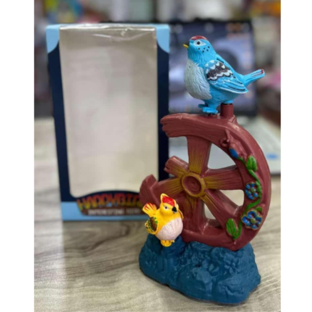 Cele două păsări, una așezată pe roată și cealaltă pe suport, oferă efecte sonore care imită ciripitul.