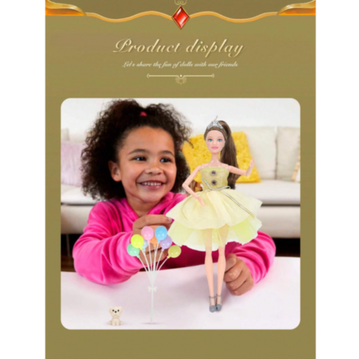 Păpușa Prințesă aduce o notă regală fiecărei zile de joacă, purtând o rochie galbenă delicată și strălucitoare.