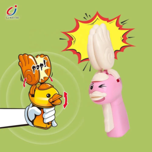 Cu o simplă apăsare, rățoiul colorat își flutură palmele, stârnind hohote de râs și uimire.