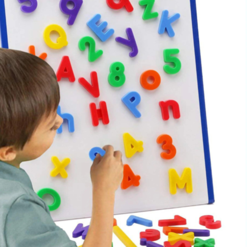 Copiii vor învăța să recunoască cifrele de la 0 la 9 și să rezolve exerciții simple de matematică folosind semnele magnetice (+, -, =, ÷, ×).