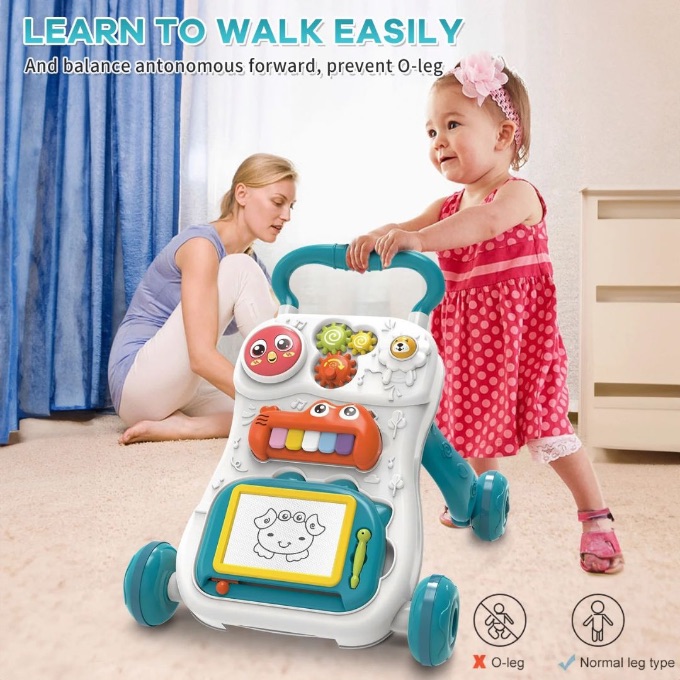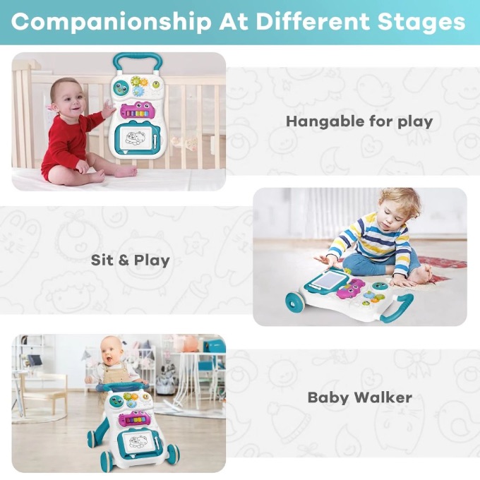 Designul modular permite utilizarea în mai multe etape — pentru stat în picioare, mers sau joacă pe podea cu panoul detașabil.