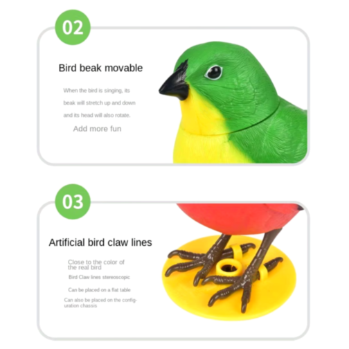 Atunci când te apropii sau faci sunet, ciocul și capul păsărilor se mișcă natural, dând impresia că păsările cântă.