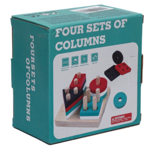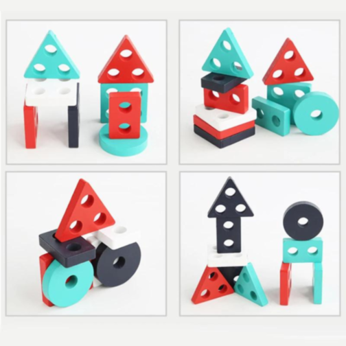 Conține forme geometrice de diferite culori și dimensiuni care trebuie potrivite pe bazele corespunzătoare, stimulând gândirea logică și recunoașterea formelor.