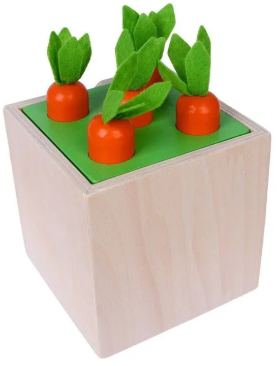 Jocul cu morcovi îi ajută pe micuți să își dezvolte dexteritatea prin scoaterea și rearanjarea morcovilor în locurile potrivite.