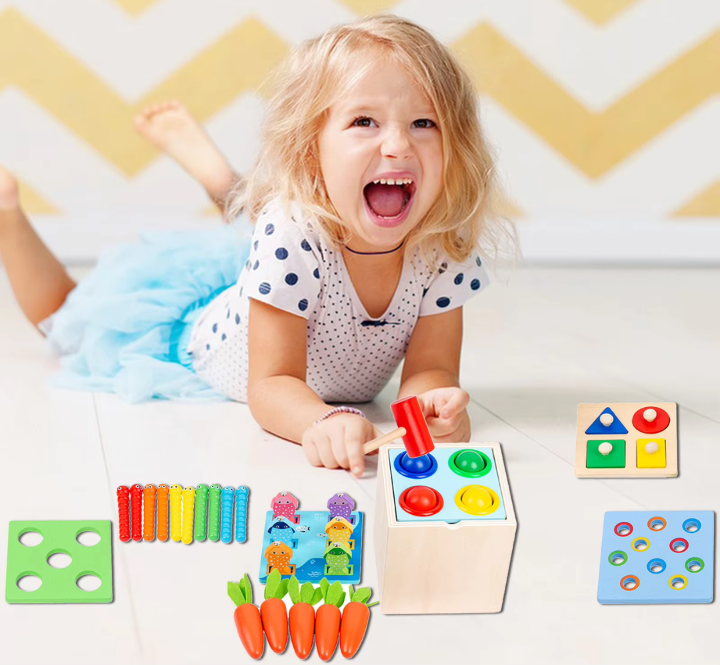 Acest set educativ din lemn oferă copiilor o varietate de jocuri captivante care stimulează imaginația și abilitățile motorii fine.