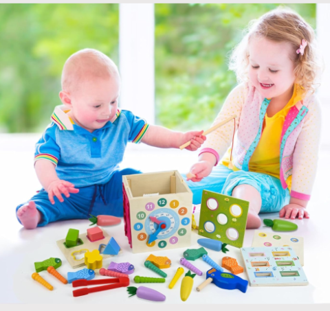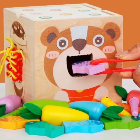 Copiii pot pescui peștișori colorați, pot folosi penseta pentru a hrăni ursulețul cu forme de mâncare sau pot sorta și recunoaște forme geometrice potrivindu-le în locurile corespunzătoare.