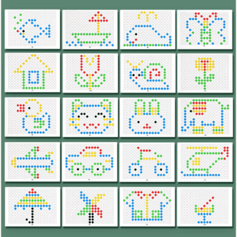Fiecare imagine din set îl provoacă să creeze animale, vehicule sau forme abstracte, dezvoltând coordonarea mână-ochi.