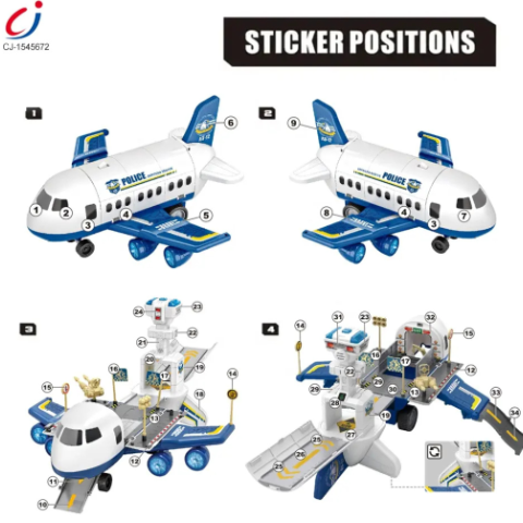Aeronava poate fi decorată cu autocolante pentru a personaliza experiența, iar vehiculele de poliție incluse completează decorul de acțiune.