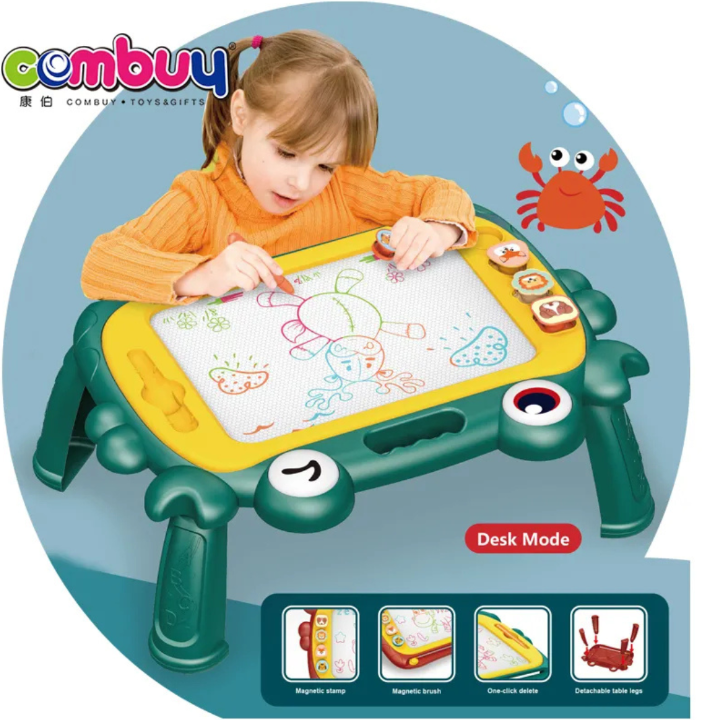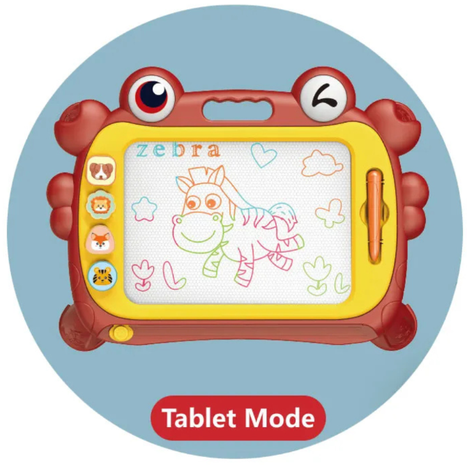 Designul prietenos, cu detalii de crab zâmbitor, face fiecare sesiune de desen o aventură creativă.