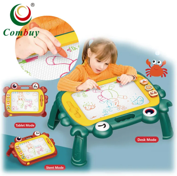 Această tablă de desen colorată și versatilă oferă copiilor multiple moduri de utilizare, de la tabletă portabilă la stand sau birou, adaptându-se perfect activităților lor creative.