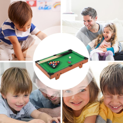 Această mini-masă de biliard oferă distracție clasică într-o formă compactă, perfectă pentru micii entuziaști ai jocurilor de masă.
