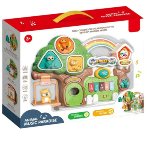 „Concertul din Pădure” oferă un pian cu cinci taste colorate, fiecare emite un sunet diferit pentru a stimula simțul muzical al celor mici.