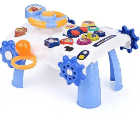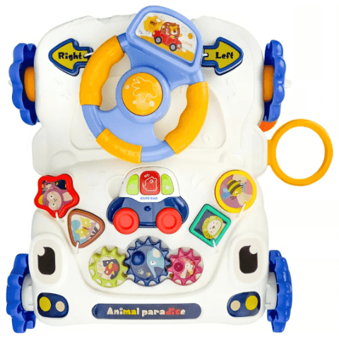 Transformarea în masă de activități oferă ore întregi de joacă educativă, cu rotițe, butoane, oglinzi și figuri vesele.