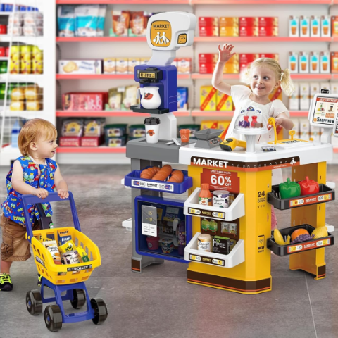 Cu 64 de accesorii incluse, copiii pot explora scenarii nelimitate de vânzare-cumpărare, dezvoltând abilități sociale și motorii.