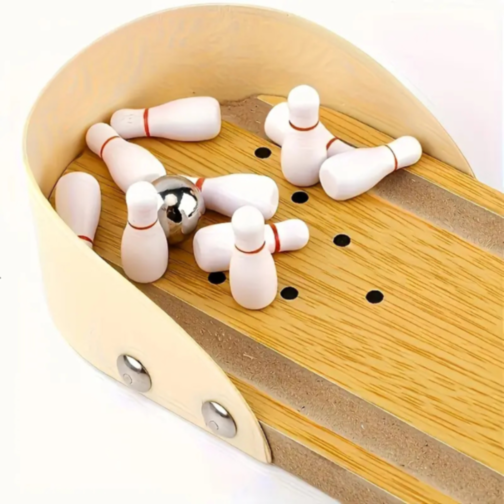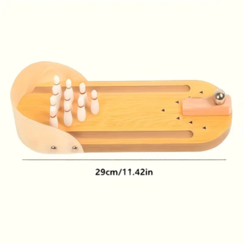 Transformă orice suprafață într-o mini-pistă de bowling cu acest joc compact și elegant, realizat din lemn natural.