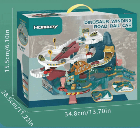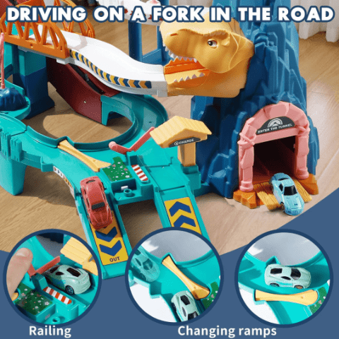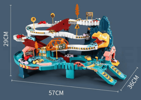 Pista de curse cu tematică dinozaur îi invită pe copii într-o aventură plină de adrenalină, cu rampe abrupte și curbe spectaculoase.