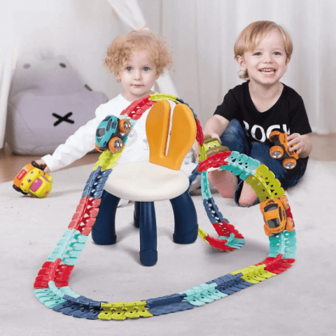 Pistele pot fi asamblate în forme variate – bucle, poduri sau trasee pe mobilier – oferind posibilități nelimitate de joacă.