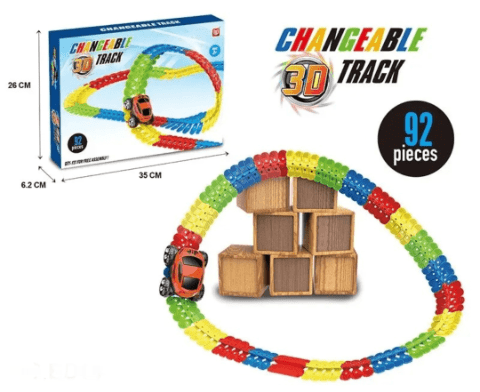 Circuitul 3D flexibil cu 92 de piese colorate îi atrage pe copii prin combinația de roșu, albastru, verde și galben, stimulând imaginația și creativitatea.