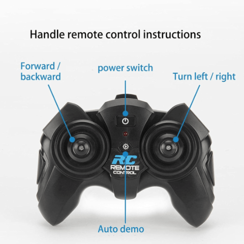 Telecomanda 2.4GHz permite control stabil în toate direcțiile, cu funcție demo pentru a arăta automat trucurile spectaculoase.