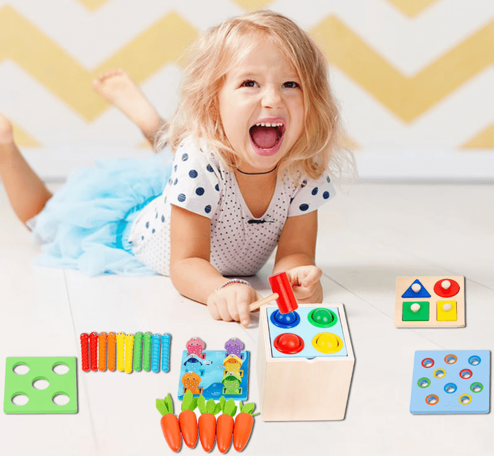 Acest set educativ din lemn oferă copiilor o varietate de jocuri captivante care stimulează imaginația și abilitățile motorii fine.