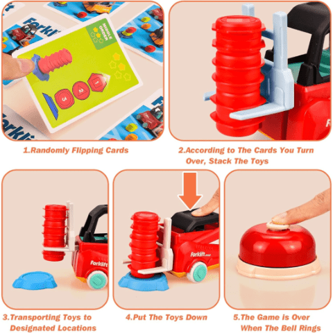 Două stivuitoare permit joc în echipă sau duel cronometrat, încurajând cooperarea și strategia.