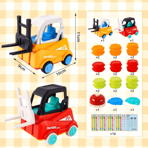 Setul conține două stivuitoare, galben și roșu, cu furci funcționale și roți care rulează ușor.