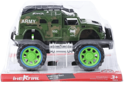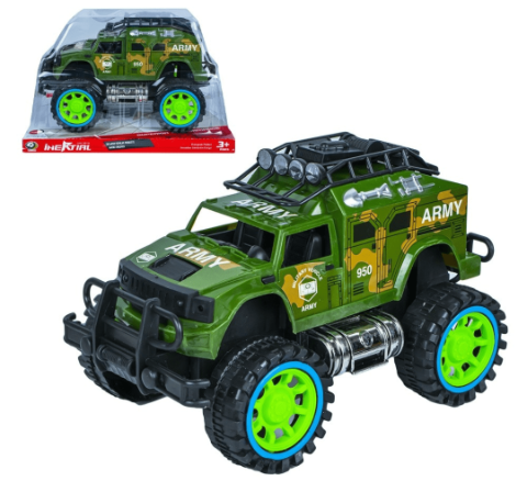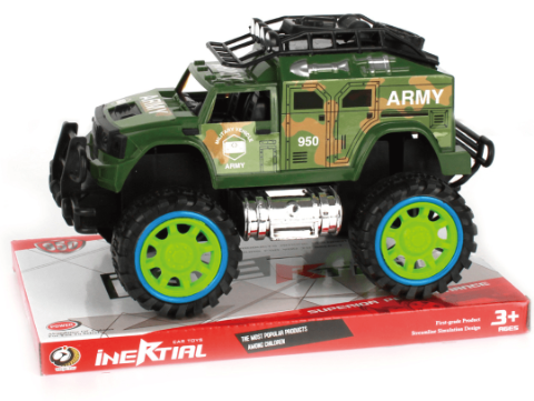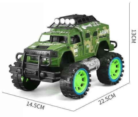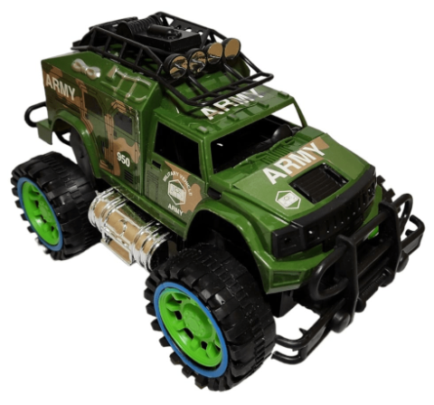 Jeepul militar verde, cu camuflaj și detalii „ARMY”, inspiră jocuri de aventură și misiuni curajoase.