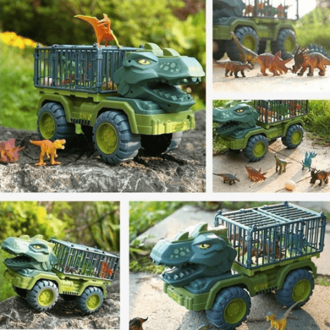 Modelele de dinozauri colorați aduc diversitate și stimulează imaginația copiilor, completând perfect decorul camioanelor masive.