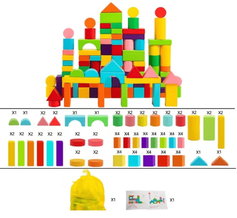 Acest set conține 100 de blocuri de construcție din lemn colorate, ideal pentru dezvoltarea abilităților motorii fine și a creativității copiilor.