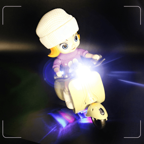 Păpușa modernă, îmbrăcată colorat și cu fes alb, conduce motocicleta cu detalii realiste, stârnind imaginația copiilor.