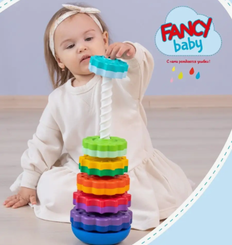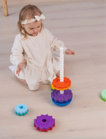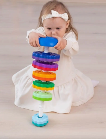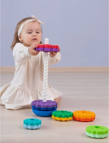 Piesele colorate pot fi stivuite și învârtite pe baza spiralei, oferind celor mici o experiență de joacă interactivă și educativă.