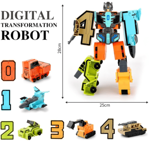 Robotul impresionant de 28 cm se formează din 5 cifre transformabile: 0, 1, 2, 3 și 4, oferind copiilor o experiență unică de asamblare și joc.