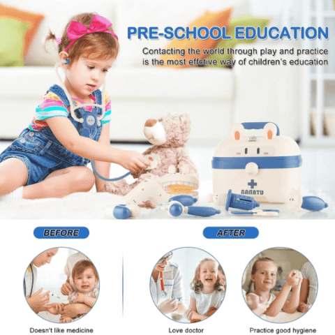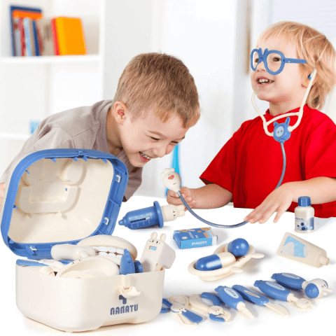 Trusa medicală tip valiză pentru copii îi introduce pe cei mici în lumea jocului de rol, încurajându-i să devină mici doctori.