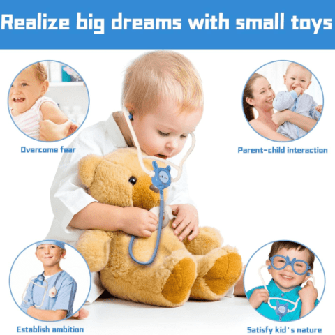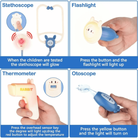 Setul conține un stetoscop cu funcție de lumină, care îi permite copilului să simuleze ascultarea inimii.