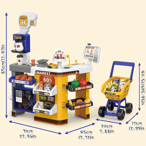 Cu 64 de accesorii incluse, copiii pot explora scenarii nelimitate de vânzare-cumpărare, dezvoltând abilități sociale și motorii.