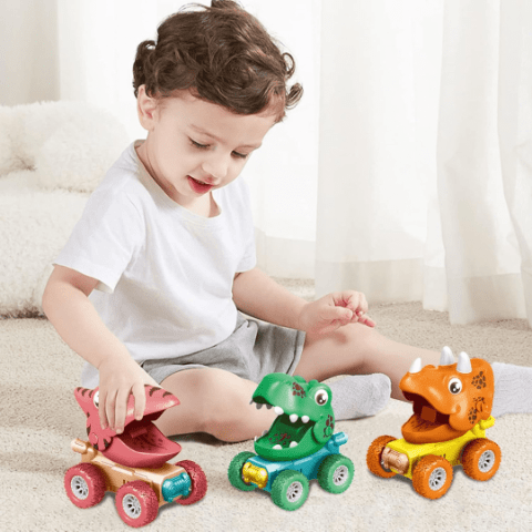 Mașinuța dinozaur are un design vesel și colorat, cu detalii prietenoase care atrag atenția copiilor.
