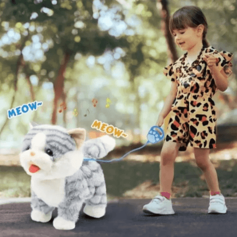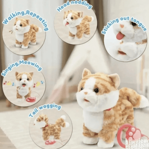 Pisicuța merge, dă din coadă, dă din cap și chiar scoate limbuța, imitând gesturile unui animal adevărat.