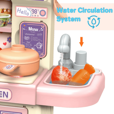 Chiuveta este prevăzută cu sistem de circulație a apei, astfel încât copiii pot spăla legumele și fructele ca într-o bucătărie adevărată.