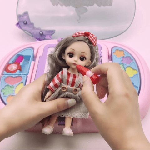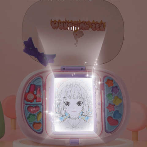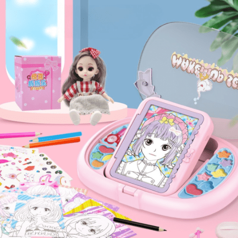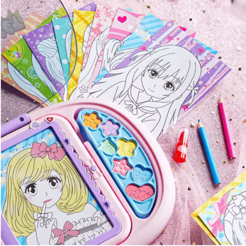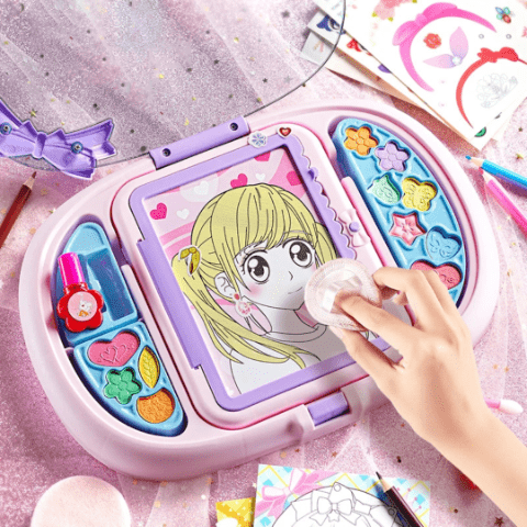 Trusa portabilă transformă desenul în joacă: copiii „machiază” personaje anime direct pe planșa din centru.