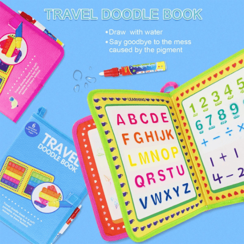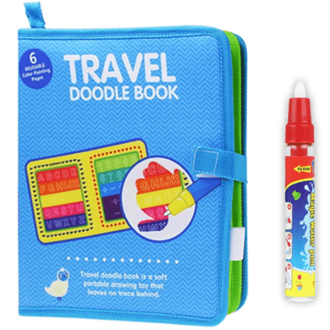 Cartea „Travel Doodle Book” are o copertă colorată, rezistentă și vine împreună cu un pix magic pe bază de apă, ideal pentru desen fără murdărie.