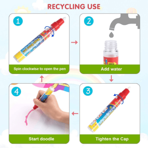 Pixul se umple ușor cu apă și scrie pe paginile speciale, lăsând în urmă culori vii care dispar singure după câteva minute.
