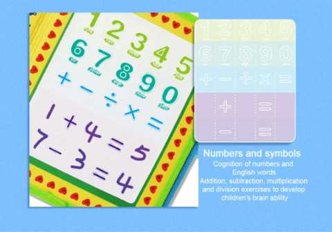 Paginile cu numere și simboluri oferă exerciții simple de matematică, dezvoltând logica și gândirea.