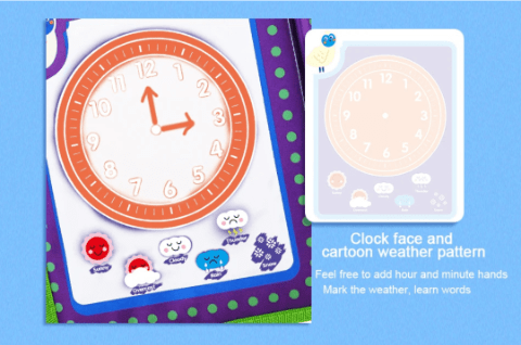 Copiii pot descoperi noțiuni de timp și vreme prin paginile dedicate ceasului și modelelor de anotimpuri.