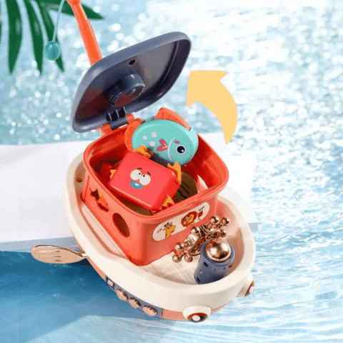 Barca interactivă are un design colorat și vesel, cu detalii realiste și veselie muzicală care atrage imediat atenția copiilor.