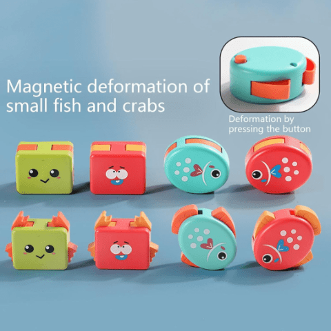 Setul include pești și crabi magnetici ce se transformă prin apăsarea unui buton, adăugând un element surpriză educativ.