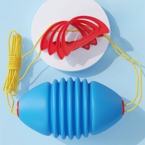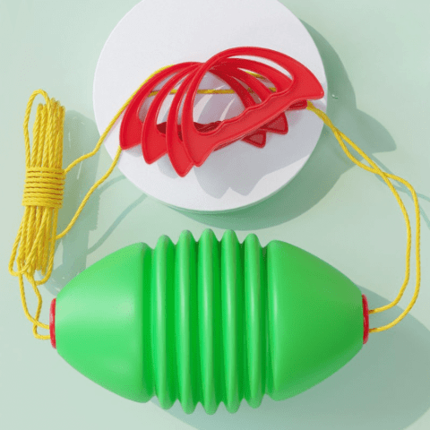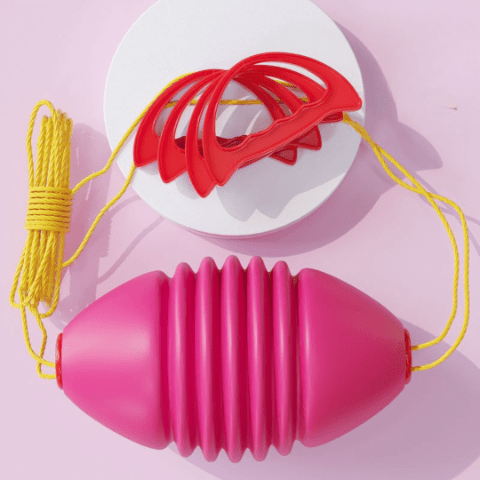 Jucăria colorată este realizată din plastic rezistent și vine echipată cu sfoară și mânere, oferind o experiență interactivă pentru copii.