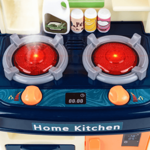 Setul include o plită cu efecte sonore și luminoase, chiuvetă cu apă reală și aburi simulați pentru a imita gătitul autentic.