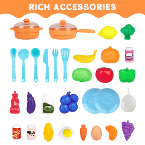 Accesoriile bogate – tacâmuri, farfurii, legume și fructe din plastic – transformă joaca într-o experiență completă și creativă.