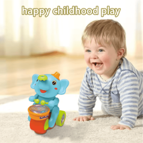 Un elefant vesel pe tricicletă atrage atenția copiilor cu designul său colorat și prietenos.